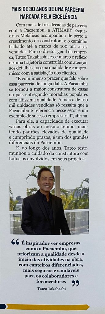 A Atimaky tem o orgulho de integrar a edição de julho de 2025 da Revista Pacaembu, reforçando uma parceria sólida que já completa 30 anos de história. Como fornecedora oficial de esquadrias da Pacaembu Construtora, hoje reconhecida como a maior construtora do Brasil, celebramos mais um capítulo dessa trajetória construída com confiança, qualidade e compromisso mútuo.